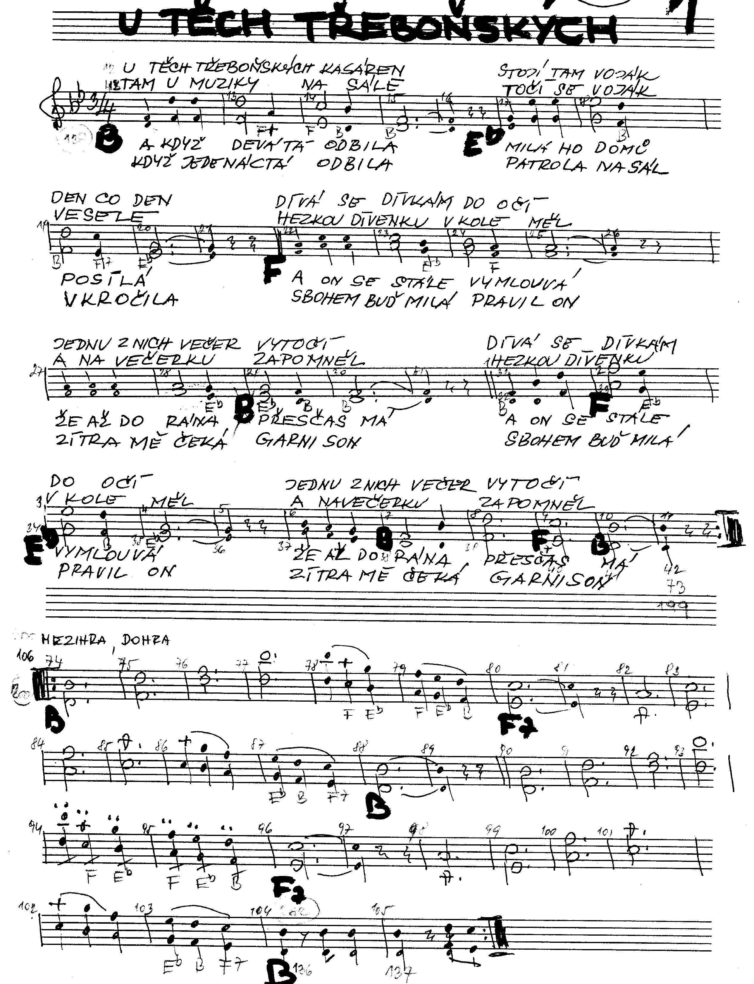U třeboňských kasárenU těch třeboňských kasáren stojí tam voják den co den, dívá se dívkám do očí jednu z nich večer vytočí. dívá se dívkám do očí jednu z nich večer vytočí Tam u muziky na sále točí se voják vesele, hezkou dívenku v kole měl a na večerku zapomněl, hezkou dívenku v kole měl a na večerku zapomněl A když devátá odbyla milá ho domů posílá, a on se stále vymlouvá, že až do rána přesčas má, a on se stále vymlouvá, že až do rána přesčas má, Když jedenáctá odbila patrola na sál vkročila, sbohem buď milá pravil on, zítra mě čeká garnizon, sbohem buď milá pravil on, zítra mě čeká garnizon. Text zaslal: Malík |