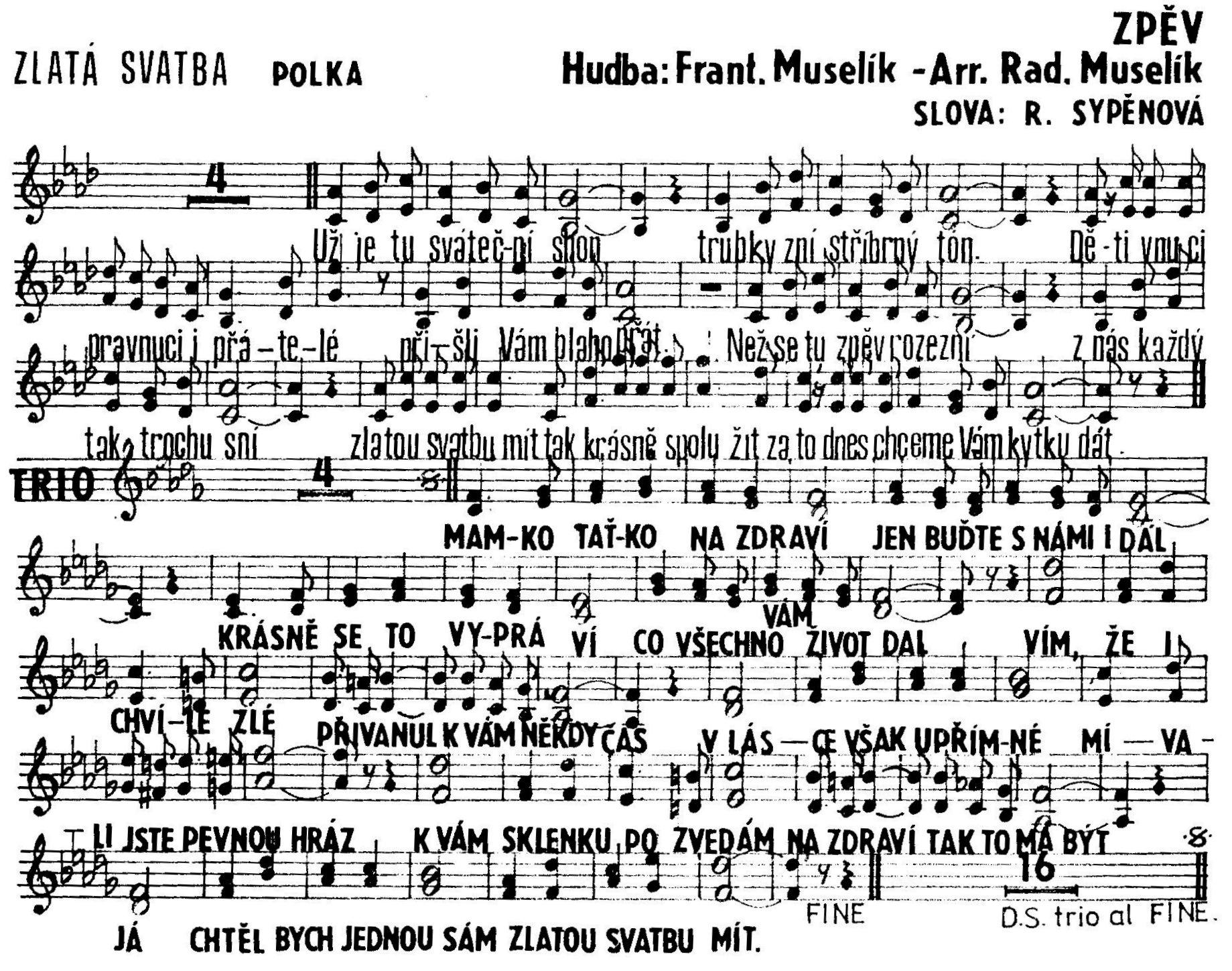 Zlatá svatbaUž je tu sváteční shon trubky zní stříbrný tón Děti vnuci pravnuci i přátele přišli Vám blahopřát Než se tu zpěv rozezní z nás každý tak trochu sní zlatou svatbu mít tak krásné spolu žít za to dnes chceme Vám kytku dát ref: Mamko taťko na zdraví jen buďte s námi i dál krásně se to vypráví co všechno vám život dal vím že i chvíle zlé přivanul k vám někdy čas v lásce však upřímně mívali jste pevnou hráz k vám sklenku pozvedám na zdraví tak to má být já chtěl bych jednou sám zlatou svatbu mít. .. mezihra ... Mamko taťko na zdraví jen buďte s námi i dál krásně se to vypráví co všechno vám život dal vím že i chvíle zlé přivanul k vám někdy čas v lásce však upřímně mívali jste pevnou hráz k vám sklenku pozvedám na zdraví tak to má být já chtěl bych jednou sám zlatou svatbu mít. Text zaslal: karel-Jevišovice |