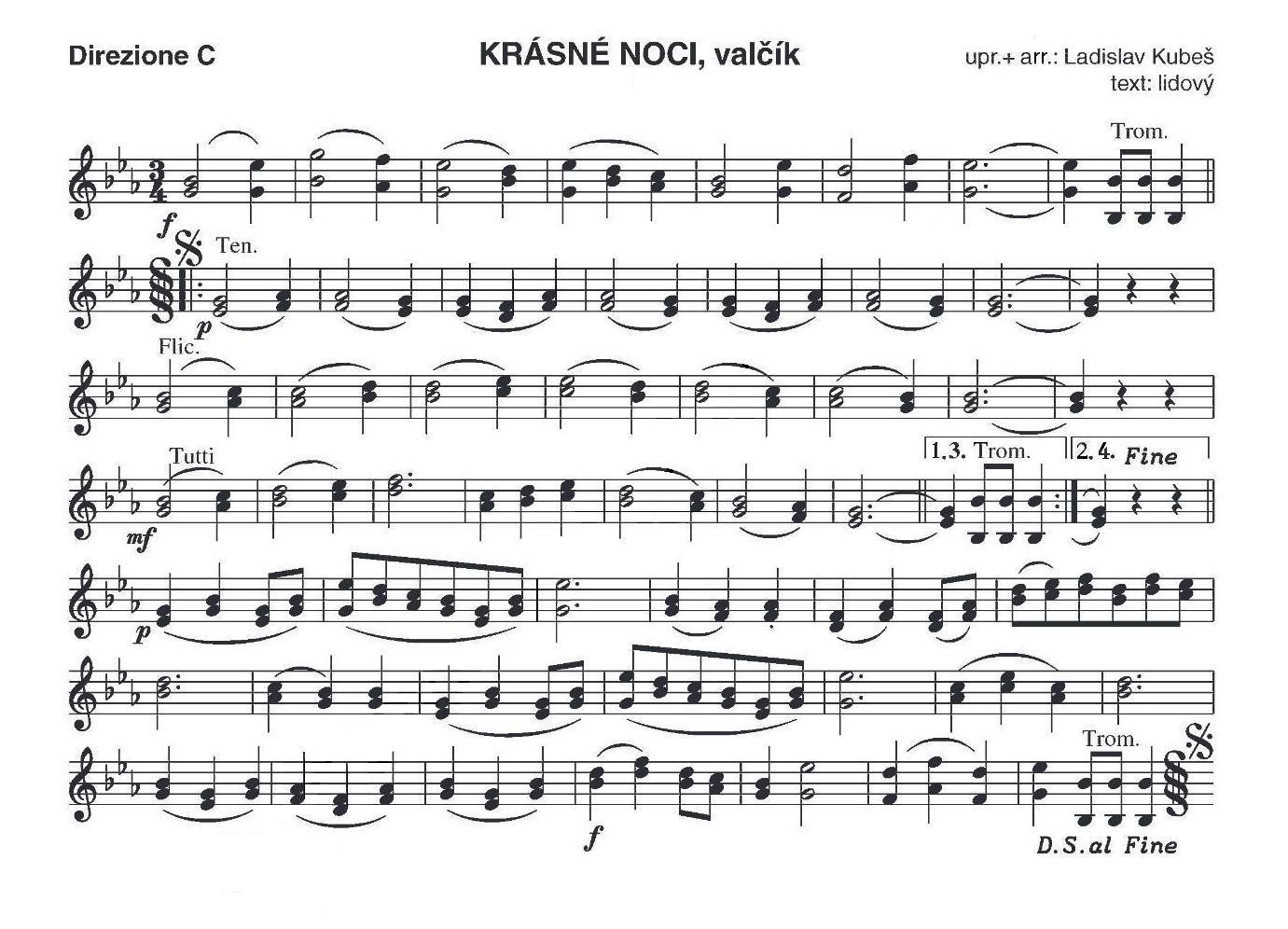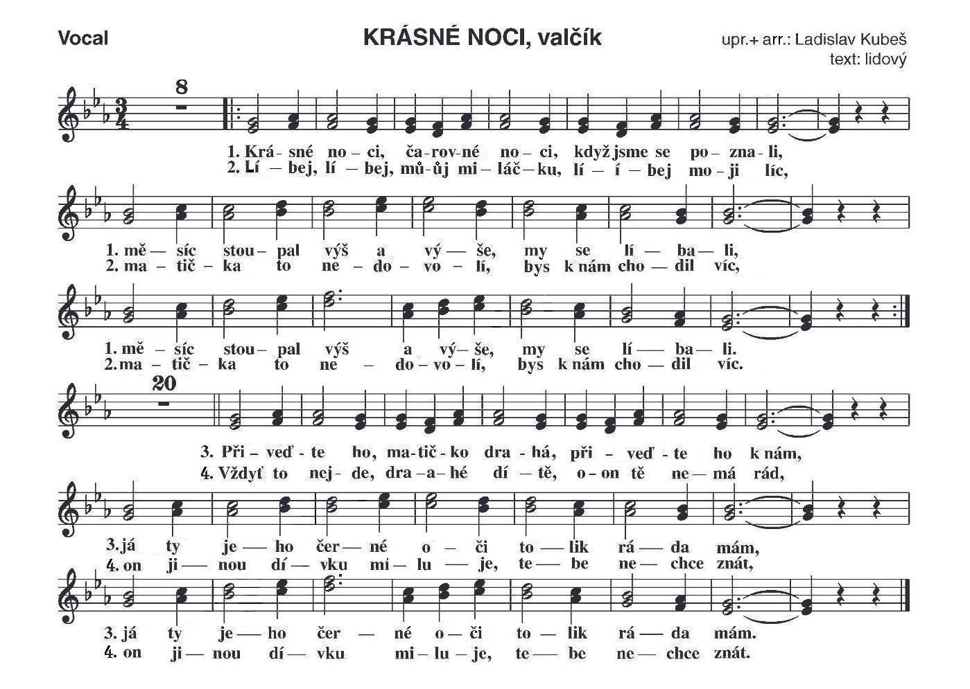 Krásné nociPředehra: || 8 taktů || 1. Krásné noci, čarovné noci, když jsme se poznali. Měsíc stoupal výš a výše, my se líbali. Měsíc stoupal výš a výše, my se líbali. 2. Líbej, líbej, můj miláčku, líbej mojí líc, matička to nedovolí, bys k nám chodil víc, matička to nedovolí, bys k nám chodil víc. Mezihra: || 20 taktů || 3. Přiveďte ho, mátičko drahá, přiveďte ho k nám, já ty jeho černé oči tolik ráda mám. já ty jeho černé oči tolik ráda mám. 4. Vždyť to nejde, drahé dítě, on tě nemá rád, on jinou dívku miluje, tebe nechce znát, on jinou dívku miluje, tebe nechce znát. Text zaslal: děda Milan |