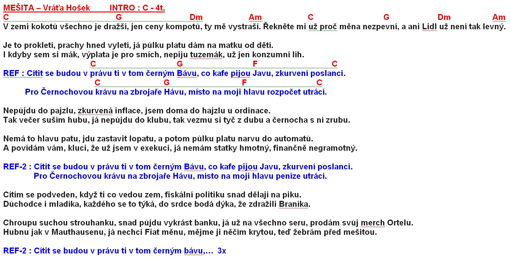 MešitaV zemi kokotu všechno je dražší, jen ceny kompotu, ty me vystraší. Reknete mi už proc mena nezpevní, a ani Lidl už není tak levný. Je to prokletí, prachy hned vyletí, já pulku platu dám na matku od detí. I kdyby sem si mák, výplata je pro smích, nepiju tuzemák, už jen konzumní líh. Cítit se budou v právu ti v tom cerným Bávu, co kafe pijou Javu, zkurvení poslanci. Pro Cernochovou krávu na zbrojare Hávu, místo na moji hlavu rozpocet utrácí. Nepujdu do pajzlu, zkurvená inflace, jsem doma do hajzlu u ordinace. Tak vecer suším hubu, já nepujdu do klubu, tak vezmu si tyc z dubu a cernocha s ní zrubu. Nemá to hlavu patu, jdu zastavit lopatu, a potom pulku platu narvu do automatu. A povídám vám, kluci, že už jsem v exekuci, já nemám statky hmotný, financne negramotný. Cítit se budou v právu ti v tom cerným Bávu, co kafe pijou Javu, zkurvení poslanci. Pro Cernochovou krávu na zbrojare Hávu, místo na moji hlavu peníze utrácí. Cítím se podveden, když ti co vedou zem, fiskální politiku snad delají na piku. Duchodce i mladíka, každého se to týká, do srdce bodá dýka, že zdražili Braníka. Chroupu suchou strouhanku, snad pujdu vykrást banku, já už na všechno seru, prodám svuj merch Ortelu. Hubnu jak v Mauthausenu, já nechci Fiat menu, mejme ji necím krytou, ted žebrám pred mešitou. Cítit se budou v právu ti v tom cerným Bávu, co kafe pijou Javu, zkurvení poslanci. Pro Cernochovou krávu na zbrojare Hávu, místo na moji hlavu peníze utrácí. Cítit se budou v právu ti v tom cerným Bávu, co kafe pijou Javu, zkurvení poslanci. Pro Cernochovou krávu na zbrojare Hávu, místo na moji hlavu peníze utrácí. Cítit se budou v právu ti v tom cerným Bávu, co kafe pijou Javu, zkurvení poslanci. Pro Cernochovou krávu na zbrojare Hávu, místo na moji hlavu peníze utrácí. Text zaslal: flidr |